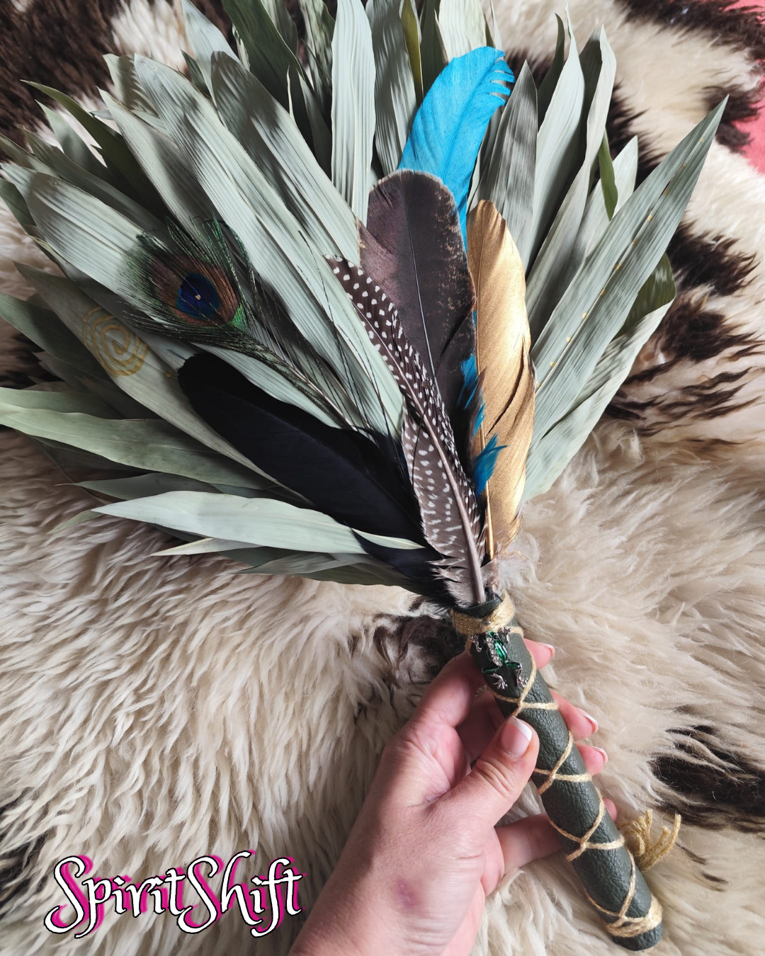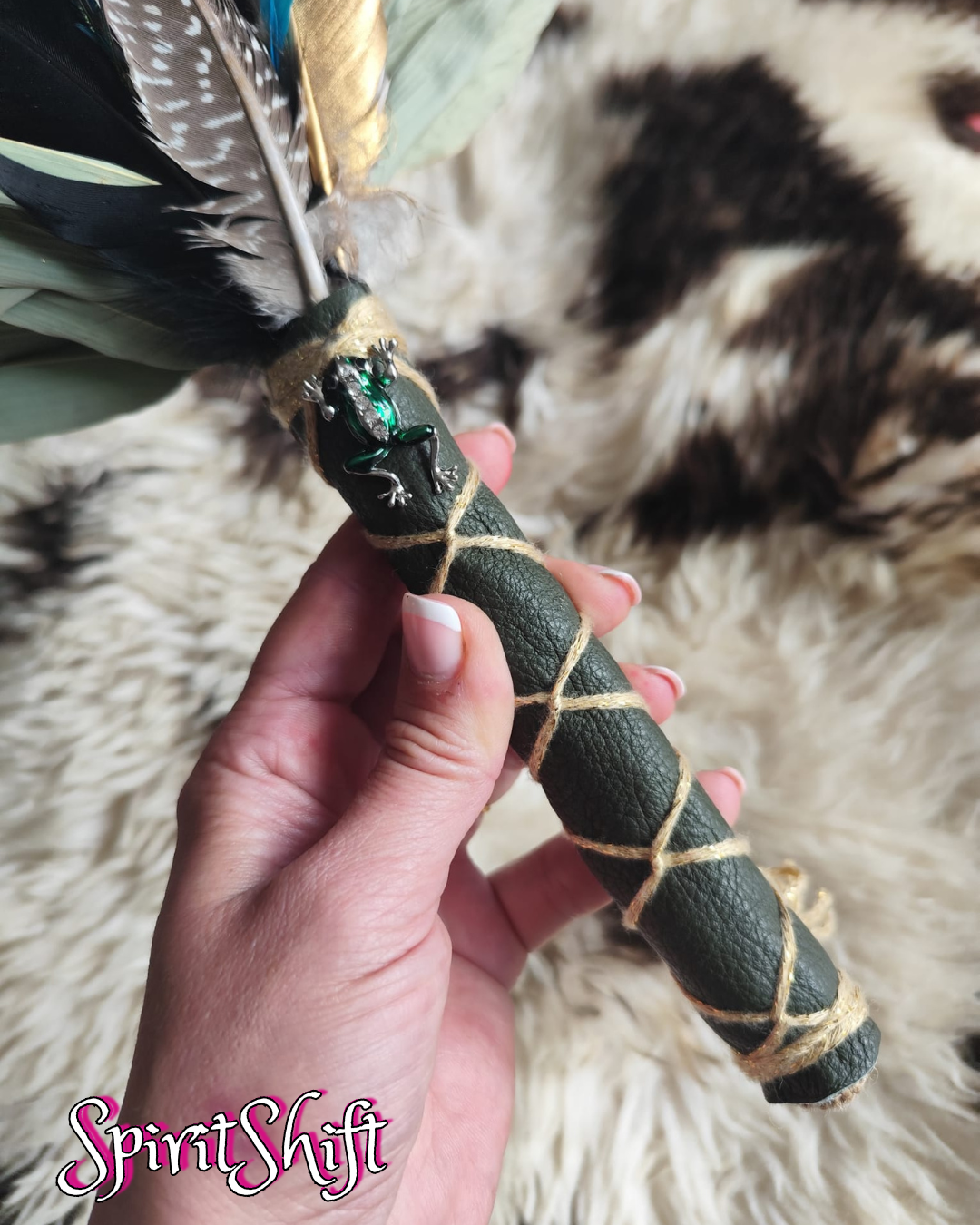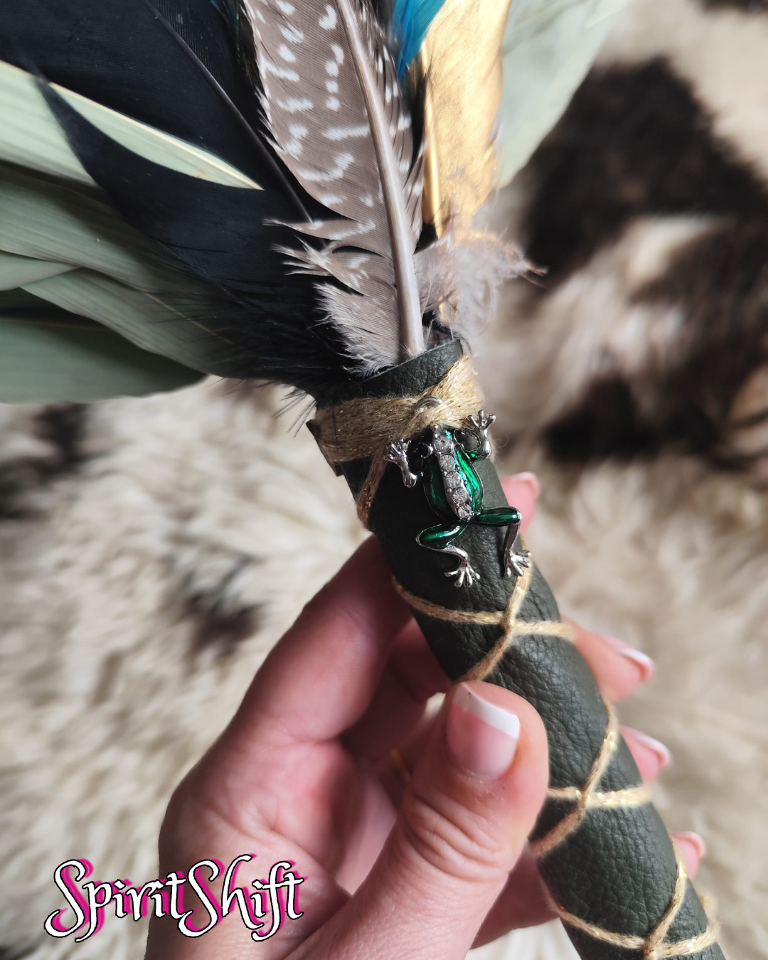 Chakapa • Green Leather • Frog Charm • Feathers • Shipibo Healing Rattle • Pre-made GENUINE SpiritShift